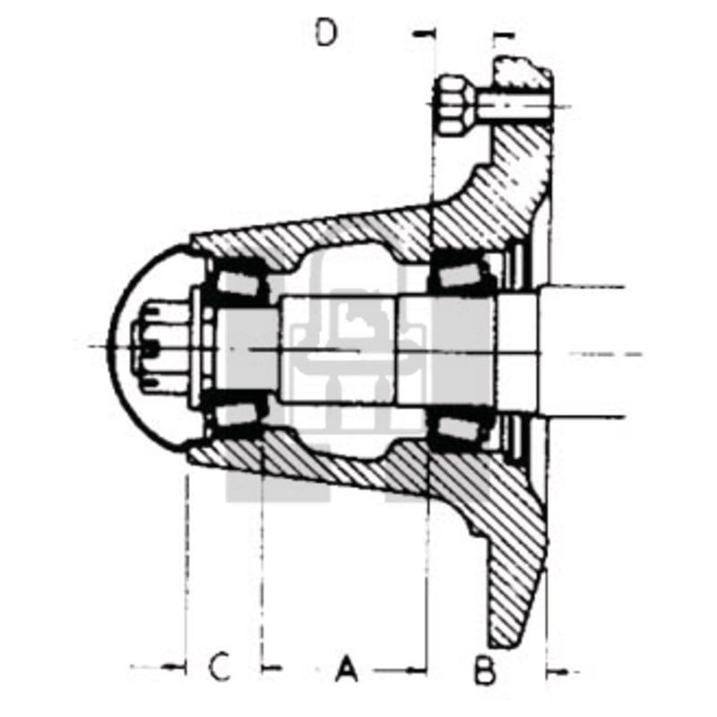 Bolt Circle: 8" Pilot: 6"Inner cup bore: 1.79Outer cup bore: 1.38Dimmension A: 2.50Dimmension B: 1.75Dimmension C: 1.12Dimmension D: .88Capacity in pounds: 4910Bearings and races included and used in this hub: 22590, 22520, 25877, 25821.Made in the USA by GKNSpindle sold seperately. Pack of 1