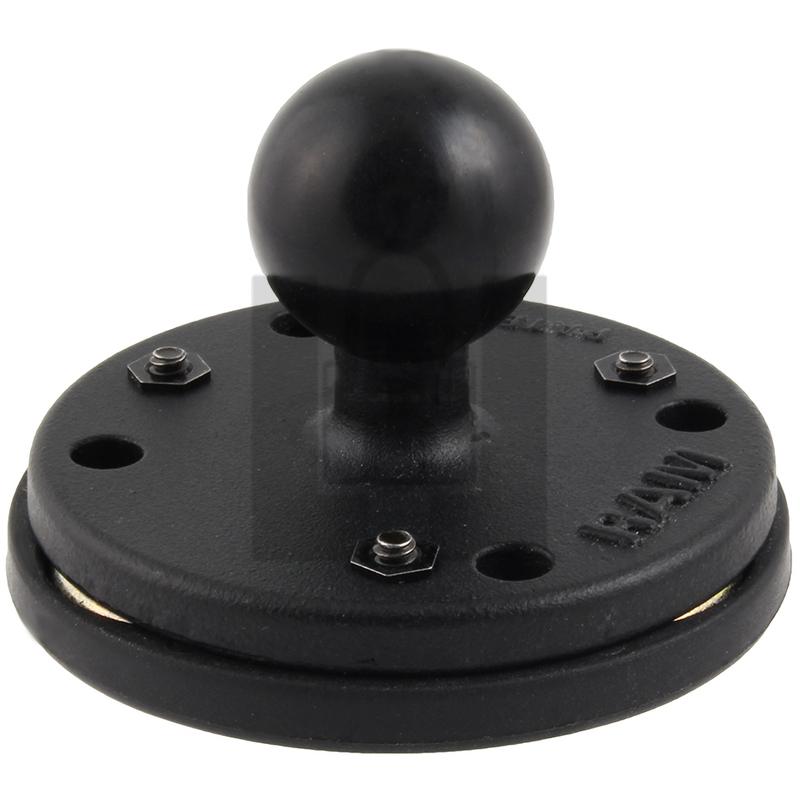 The RAM-B-202-339U consists of a 1" diameter rubber ball connected to a flat 2.5" diameter base and triple magnetic base adapter. The 2.5" diameter base contains pre-drilled holes, including the universal AMPS hole pattern. The magnetic base adapter contains 3 rare earth magnets that hold firm to ferrous metals. Simply put this product near the mounting surface and feel it almost jump out of your hand. The composite adapter designed to conceal the magnets is made of durable composite to prevent scratching the mounting surface. Ideally suited for many applications, you're sure to find many ways to use your new magnetic mount at work, home, on the go, or at play.Material: High Strength Composite & Powder Coated Marine Grade AluminumBall Size: B Size 1" Rubber Ball. Pack of 1