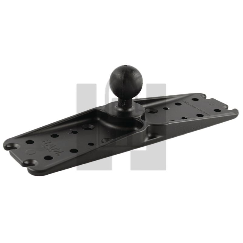 The RAM-137BU, universal mounting plate, consists of a 1.5" diameter rubber ball, connected at right angles to a flat 3" x 11" rectangular plate. The plate contains different combinations of pre-drilled holes which will match up to many electronic devices and mounts, including Marine GPS, CB Radios, Ham Radios, Gimbal Brackets and more. Pack of 1